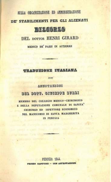 Sulla organizzazione ed amministrazione de' stabilimenti per gli alienati. Discorso del dottor Henri Girard medico de' pazzi in Auxerre. Traduzione italiana con annotazioni del dott. Giuseppe Zurli