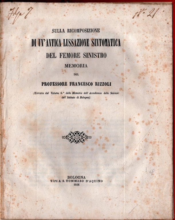 Sulla Ricomposizione di un'antica lussazione sintomatica del femore sinistro. Memoria del Professore Francesco Rizzoli