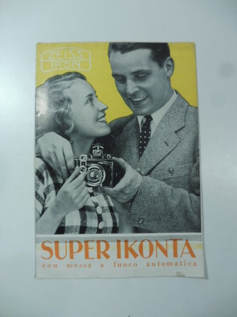 Pieghevole pubblicitario a 4 falde cm 50 x 18, a colori dedicato alla Super Ikonta, modello Zeiss Ikon che nel 1934 era appena uscito. Grafica di impostazione modernista. I primi anni di vita della Zeiss Ikon vedono la razionalizzazione della produzione, con l’eliminazione dai cataloghi dei prodotti troppo simili e l’apposizione del marchio Zeiss Ikon sulle fotocamere rimaste in produzione, ma i progetti per il futuro sviluppo dell’azienda sono ben piu' ambiziosi. Con i primi anni Trenta viene privilegiato lo sviluppo delle fotocamere per pellicola in rotoli, con le fotocamere a soffietto Ikonta 6x9cm del 1931, seguite nel 1934 dalle Super Ikonta provviste del telemetro accoppiato e la Super Nettel, ma con lo sguardo attento alle evoluzioni del settore.