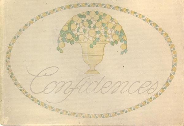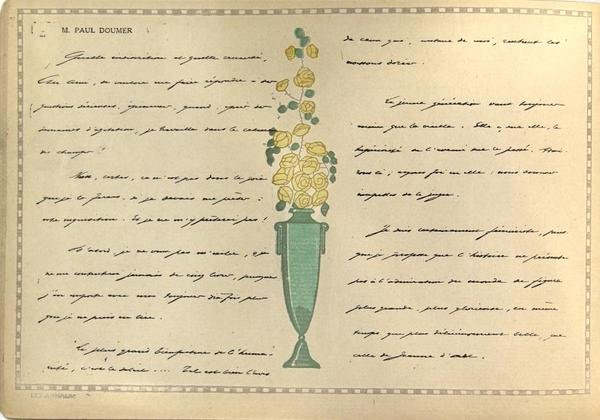 Les Annales, s.d. (1913. In-8 à l'italienne (22 x 15 cm) broché, couverture illustrée en couleurs, 30 feuillets illustrés en couleurs (7 motifs art-déco différents), textes : imprimés et en fac-simile de manuscrits. Couverture avec un petit manque en base et déchirure restaurée. Textes de : J. et P. Adam, J. Aicard, M. Barrès, Mme Bartet, H. Bataille, P. baudin, J. Bertheroy, H. Bordeaux, P. Bourget, M. Brieux, A. Brisson, G. Cain, A. Capus, E. Clavé, Bonhomme Crysale, J. Clarétie, G. Courteline, F. de Croisset, Mme A. Daudet, M. Donnay, P. Doumer, Dranem, E. Faguet, A. Faivre, Cl. Ferval, G. Feydeau, C. Flammarion, Funck-Brentano, F. Gregh, Yvette Guilbert, S. Guitry, Gyp, R. Hahn, P. Hervieu, Kistemaechers, H.Lapauze, H. Lavedan, Melle Marie Leconte, D. Lesueur, J.Lemaitre, A. Linchtenberger, M. Linthilac, F. Mistral, F. Masson, P. Margueritte, J. Normand, Mounet-Sully, Paul-Boncour, Mme Piérat, Mme J. Poilpot, C. Saint-Saens,M. Th. Poilpot, G. de Porto-Riche, M.Prévost, J. Richepin, Duchesse de Rohan, H. Roujon,J.H.Rosnay ainé, Y. Sarcey, Sem, Second- Weber, Sergines, Mme de Thébes, J. Truffier, M. Rinayre, E.Verhaeren, A.Willette, M. Zamacois, C. Zambelli.