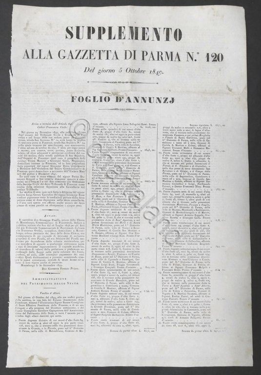 Supplemento alla Gazzetta di Parma N. 120 - 5 Ottobre 1849 - Vendita d'alberi