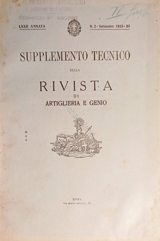Supplemento Tecnico della Rivista di Artiglieria e Genio N.2 - LXXII Annata - 1933-XI Testo in lingua italiana. Pagine 100 ca., con illustrazioni, carte ripiegate e tavole. Copertina morbida. Condizioni molto buone.