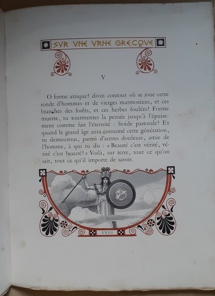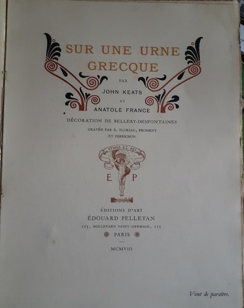 “Par John Keats et Anatole France. Décoration de Bellery-Desfontaines gravée par E. Floria, Froment et Perrichon”. In -4°, pp. 30, brossura editoriale con sovracoperta e frontespizio al piatto superiore. Esemplare numerato, n. 159 su un totale di 235, stampato su “velin du Marais”. Edizione bilingue del testo di Keats, stampata in occasione dell’esposizione franco-britannica di Londra, con illustrazioni in nero e rosso di Bellery-Desfontaines, incise da Florian, Froment e Ferrichon. Piccolo foro di tarlo, non incide sul testo.