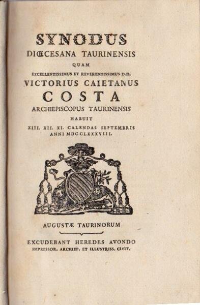 Synodo dioecesana Taurinensis quam exellentissimus et reverendissimus D.D. Victorius Caietanus Costa, Archiepiscopus taurinensis habuit XIII. XII. XIO. calendas septembris anni MDCCLXXXVIII