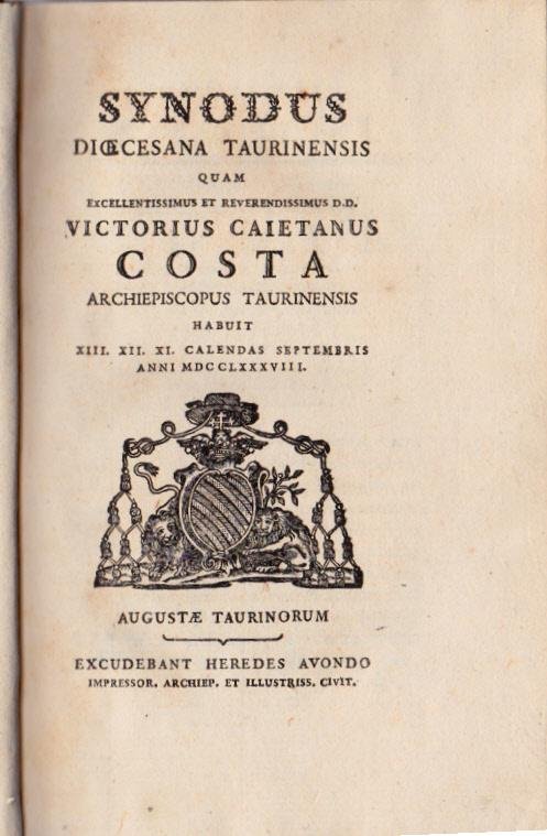 In-8°, pp. 292, legatura in piena pelle con fregi e titoli in oro su tass. al dorso. Al frontespizio bello stemma arcicesovile. Resoconto del Sinodo tenutosi nella città di Torino il 20-22.8.1788 dall'arcivesovo Vittorio Gaetano Costa d'Arignano dei Conti della Trinità (1778-1796).
