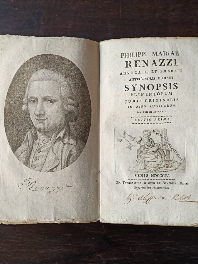 In-8° (cm. 21,4), brossura coeva con titolo anticamente manoscritto al dorso (tassello di collocazione al piede, piccola mancanza al piede, alcune tracce d'uso); pp. XVI 247 [1b] in barbe, in stato molto buono (lievi e sporadiche fioriture, integrazione alla sola p.147 con mancanza di piccola parte del testo); con 1 ritratto dell'autore in tondo all'antiporta fuori testo ed una graziosa vignetta allegorica con la Giustizia bendata incisa in rame al frontespizio. Prima edizione di quest'opera giuridica sul diritto criminale, adottato in molte università italiane come libro di testo. Nei quattro libri che compongono il volume, il Renazzi fu il primo a tentare una concisa storia critica della disciplina del diritto penale. Antica firma di possesso al margine del frontespizio. Buon esemplare. (NG3)