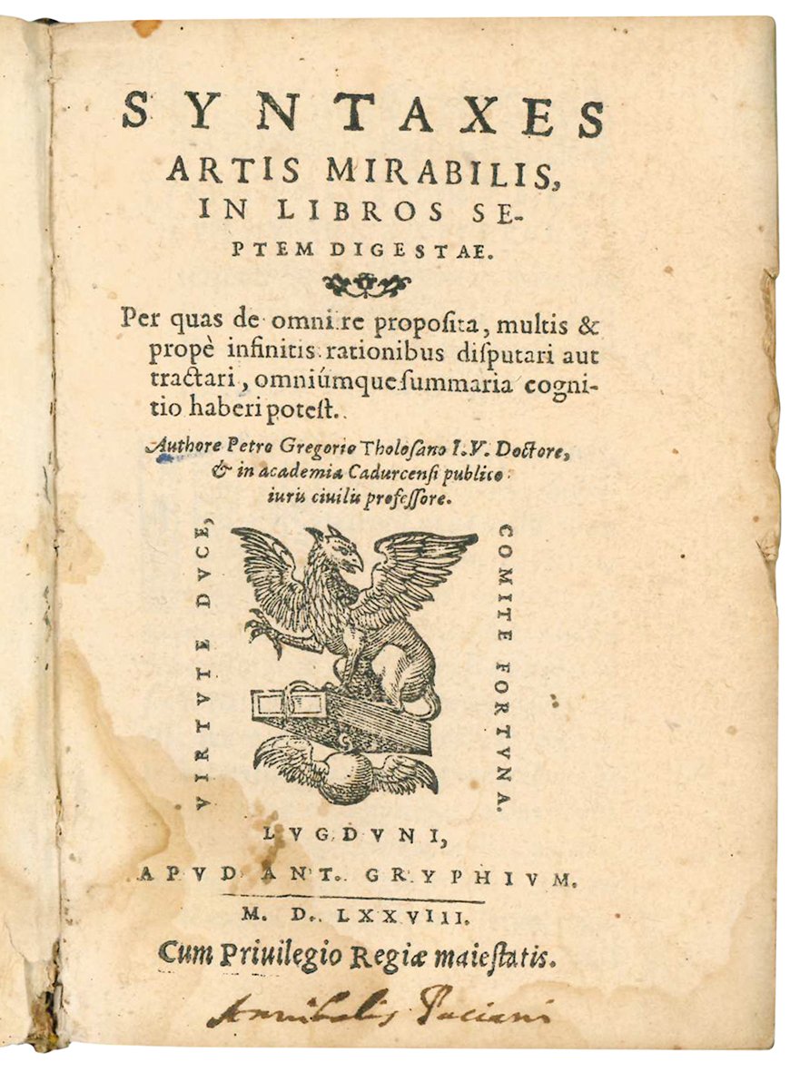 Syntaxes artis mirabilis, in libros septem digestae. Per quas de omni re proposita, multis & propè infinitis rationibus disputari aut tractari, omniumque summaria cognitio haberi potest (legato con:) Commentaria in prolegomena syntaxeōn mirabilis artis, per quam de omnibus disputatur habeturque cognitio.