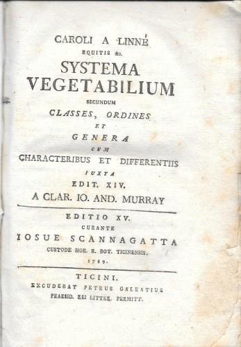 Systema vegetabilium secundum classes, ordines, et genera cum characteribus et differetiis, iuxta edit. XIV a Clar. Io.And. Murray. editio XV curante Iosue Scannagatta - Plantae officinales linneana methodo distributae