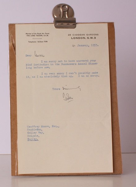 Single sheet, 8vo., a near fine copy. Signed simply 'Tedder' in the writer's usual manner, the letter is written to Geoffrey Moore, founder of the Buccaneers Cricket Club, and demonstrates the airman's keen and continuing interest in the sport. Tedder was President of Surrey County Cricket Club from 1953 to 1958. The letter regretfully declines Moore's invitation to attend the Buccaneer's annual dinner (held at Lords). Marshal of the RAF Arthur William Tedder, 1st Baron Tedder (1890-1967) was one of Britain's most distinguished air commanders. Educated at Whitgift School and Magdalene College, Cambridge, he transferred from the Dorsetshire Regiment to the Royal Flying Corps in 1916, serving in France from 1915- to 1917 and in Egypt from 1918 to 1919. He was then commissioned in to the (new) Royal Air Force where was appointed Director of Training from 1934 to 1936, after which he became Commander RAF Far Eastern Forces. During WWII he was head of RAF Middle East Command, controlling Allied air operations in the Mediterranean and North Africa, including the evacuation of Crete and the defeat of Rommel; his air power was a vital component of Montgomery's victory at El Alamein. Having been promoted to Air Marshal, Tedder then took part in the early planning for D-Day, and was subsequently appointed Deputy Supreme Commander Allied Forces Europe (the most senior such British position) immediately beneath General Eisenhower, on whose behalf he signed at the German Surrender in 1945. In 1947 he delivered the Lees Knowles lecture, afterwards published as 'Air Power in War'. Following his retirement he served as Chancellor of Cambridge University and Vice-Chairman of the Board of Governors of the BBC. Founded in 1930, The Buccaneers is one of the oldest and most famous 'wandering' clubs in English cricket (a 'wandering' club has no fixed home ground but plays consistently as an 'away' team relying on the hospitality of the 'home' clubs against which it competes). The Club's history has been written twice, by Clifford Bax in 1956 and more recently by Howard Spencer. ORIGINAL DOCUMENTS SIGNED BY TEDDER ARE EXTREMELY SCARCE.