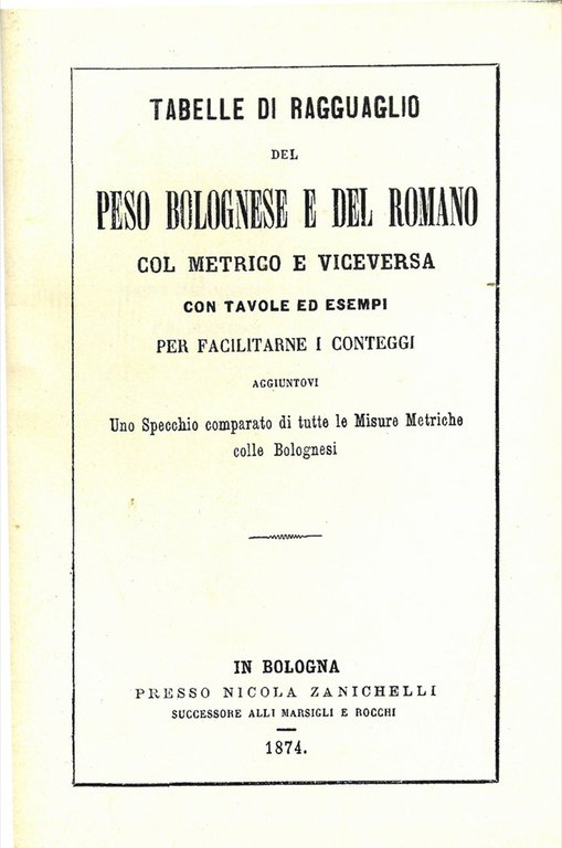Tabelle di ragguaglio del peso bolognese e del romano col metrico e viceversa. Con tavole ed esempi per facilitarne i conteggi aggiuntovi Uno specchio comparato di tutte le Misure Metriche colle Bolognesi.