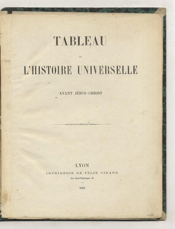 Lyon, Imprimerie de Félix Girard, 1868, in-4 piccolo, legatura coeva in mezza tela muta, pp. 16. Con una tabella cronologica più volte ripiegata in fine.