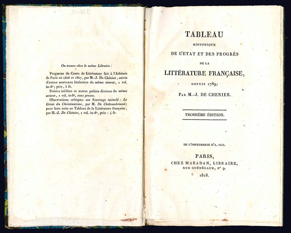 Tableau historique de l'etat et des progrés de la Littérature Francaise depuis 1789; par M.-J. De Chenier. Troisième édition.