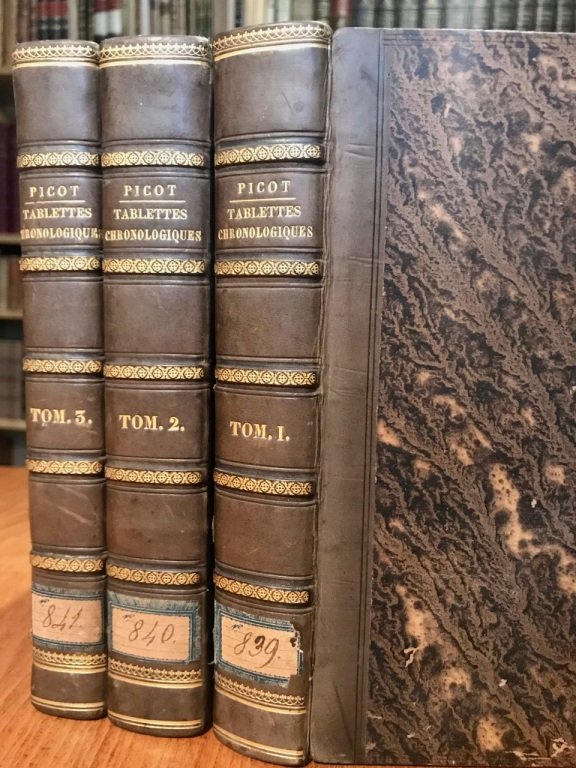 3 volumi in-8° (cm. 20,3) solide ed eleganti legature coeve in mezza pelle con titolo e fregi in oro ai dorsi, filetti a secco sempre ai dorsi, tagli spruzzati, risguardi marmorizzati; pp. [4] XXVI [2] 589, [4] 605, [4] 469 in buono stato, lievi fioriture sparse. Opera in edizione originale che si ispira alle Tablettes chronologiques di Lenglet du Fresnoy (1744). Esemplare molto buono. (SB3)