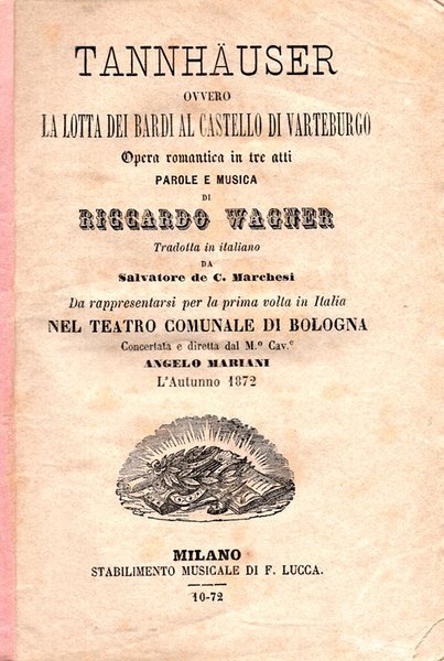 Libretto d’opera. Teatro Comunale di Bologna, Autunno 1872. Piccola asportazione all’angolo del frontespizio. Elenco dei personaggi completo dei nomi degli interpreti tra cui Federica Grun e Giuliano Gayarre. Direttore Angelo Mariani. É il libretto della prima rappresentazione italiana che andò in scena a Bologna il 10 Novembre 1872.