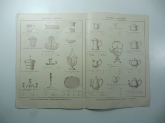 In 8 (cm 19,5 x 27,5), pp. 9 + (1) con illustrazioni nel testo. Brossura editoriale. Catalogo illustrato con prezziario delle posate e argenterie francesi Christoffe distribuite in Italia dalla Richard Ginori.