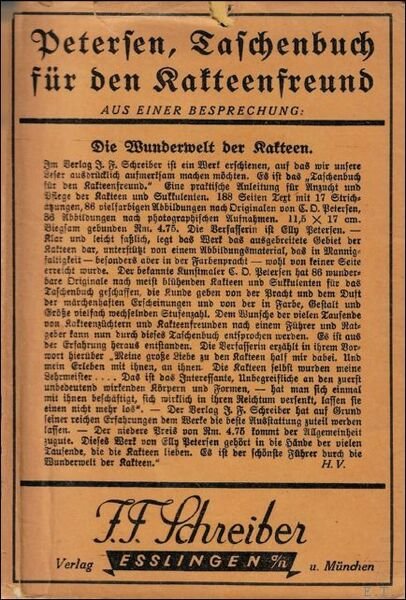 Brochiert mit Schutzumschlag, 120 x 170mm., 180S. + Tabeln coloriert. Eine praktische Unleitung fur Unzucht und Pflege der Kakteen und Sukkulenten. Guter Zustand.