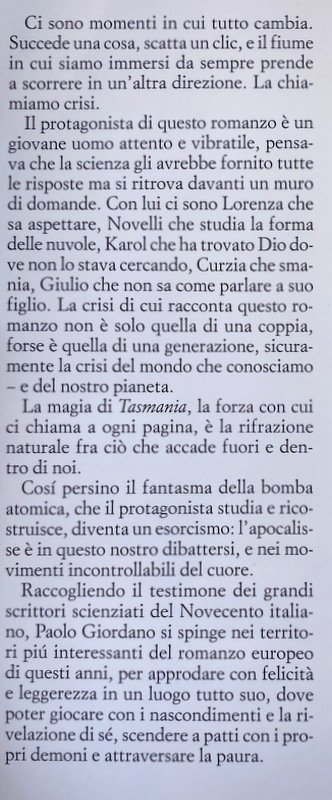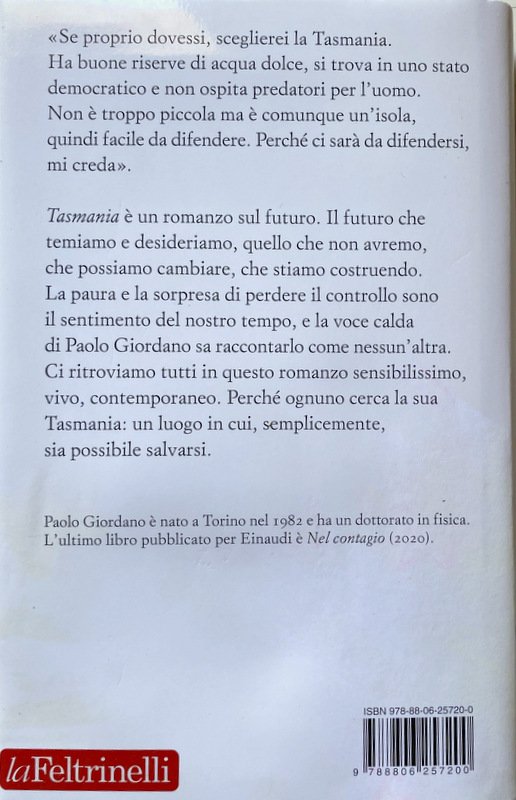 «Se proprio dovessi, sceglierei la Tasmania. Ha buone riserve di acqua dolce, si trova in uno stato democratico e non ospita predatori per l'uomo. Non è troppo piccola ma è comunque un'isola, quindi facile da difendere. Perché ci sarà da difendersi, mi creda». Tasmania è un romanzo sul futuro. Il futuro che temiamo e desideriamo, quello che non avremo, che possiamo cambiare, che stiamo costruendo. La paura e la sorpresa di perdere il controllo sono il sentimento del nostro tempo, e la voce calda di Paolo Giordano sa raccontarlo come nessun'altra. Ci ritroviamo tutti in questo romanzo sensibilissimo, vivo, contemporaneo. Perché ognuno cerca la sua Tasmania: un luogo in cui, semplicemente, sia possibile salvarsi. Ci sono momenti in cui tutto cambia. Succede una cosa, scatta un clic, e il fiume in cui siamo immersi da sempre prende a scorrere in un'altra direzione. La chiamiamo crisi. Il protagonista di questo romanzo è un giovane uomo attento e vibratile, pensava che la scienza gli avrebbe fornito tutte le risposte ma si ritrova davanti un muro di domande. Con lui ci sono Lorenza che sa aspettare, Novelli che studia la forma delle nuvole, Karol che ha trovato Dio dove non lo stava cercando, Curzia che smania, Giulio che non sa come parlare a suo figlio. La crisi di cui racconta questo romanzo non è solo quella di una coppia, forse è quella di una generazione, sicuramente la crisi del mondo che conosciamo, e del nostro pianeta. La magia di Tasmania, la forza con cui ci chiama a ogni pagina, è la rifrazione naturale fra ciò che accade fuori e dentro di noi. Così persino il fantasma della bomba atomica, che il protagonista studia e ricostruisce, diventa un esorcismo: l'apocalisse è in questo nostro dibattersi, e nei movimenti incontrollabili del cuore. Raccogliendo il testimone dei grandi scrittori scienziati del Novecento italiano, Paolo Giordano si spinge nei territori più interessanti del romanzo europeo di questi anni, per approdare con felicità e leggerezza in un luogo tutto suo, dove poter giocare con i nascondimenti e la rivelazione di sé, scendere a patti con i propri demoni e attraversare la paura.