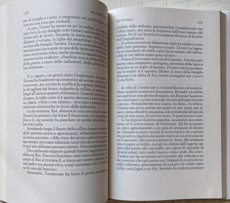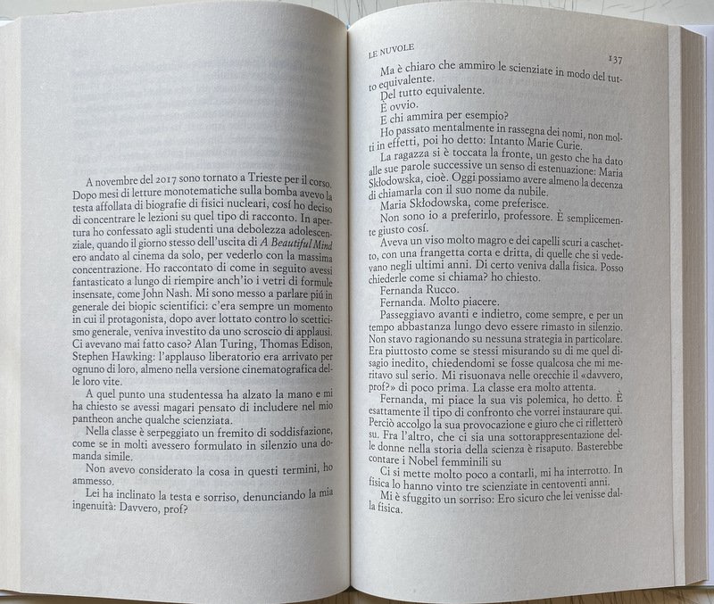 Adriano aspettare attimo bomba cambiato capito casa Christian città Cobalt conosciuto Curzia diverso domanda Eugenio Enrico Fermi figlio fisica forma giorno Giulio immagini insieme Karol lavoro letto Lorenza luce madre mare mattina mesi messaggi mezzo momento mondo Novelli nuvole Parigi passato pensato persone piedi posto presente preso ragazzo ricordo sala scienziati scritto scrivere seduto senso sentito sera sistema stanza strano studio successo telefono Terumi testa tornare vivere Divorare il cielo, Nel contagio