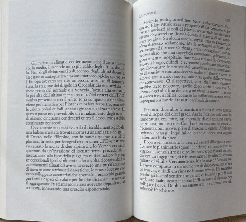 Soggetti: Narrativa contemporanea, Letteratura italiana, Romanzi, Viaggio, Africa, Salvezza, Attualità, Ecologia, Ambiente, Pianeta, Relazioni, Coppie, Scienza, Nucleare, Bomba atomica, Scambio di coppia, Cambiamenti climatici, Clima, Crisi, Fisica, Futuro, Lettura, Politica, Società, Tasmanien, Tasmanië, Flusso di coscienza, Terrorismo islamico, Attentati, Isis, Vacanze, Viaggiare, Natura, Guadalupa, Ricerca, di sé, Mutamenti, Amore, Vita, Umanità, Autodistruzione, Tutela ambientale, Romanzo, Giornalismo, Reportage, Autofiction, Pandemia, Siccità, Divorzio, Gender gap, Lanzarote, Inquinamento, Angoscia esistenziale, Surriscaldamento, Scioglimento dei ghiacciai, Innalzamento degli oceani, Giovani, Famiglia, Speranza, Libri attuali, Anni Duemila, Attualità, Mondo, La solitudine dei numeri primi, Premio Campiello, Il corpo umano, Il nero e l'argento, Divorare il cielo, Contemporary Fiction, Italian Literature, Novels, Travel, Salvation, Current Affairs, Ecology, Environment, Planet, Relations, Couples, Science, Nuclear, Atomic Bomb, Couple Swap, Climate Change, Climate, Crisis, Physics, Future, Reading, Politics, Society, Stream of consciousness, Islamic terrorism, Attacks, Holidays, Travel, Nature, Guadeloupe, Search, self, Changes, Love, Life, Humanity, Self-destruction, Environmental protection, Novel, Journalism, Pandemic, Drought, Divorce, Pollution, Distress existential, Global warming, Melting Glacies, Rising oceans, Young people, Family, Hope, Current books, 2000s, Current affairs, World, The solitude of prime numbers, Prize, The human body, Black and silver, Devour the sky, Italia, Venezia, Acqua alta, Roma, Riscaldamento globale, Turismo di massa, Social, Elon Musk, Clairaudients, Kill or be killed, Marie Curie, Radiazioni, Apocalisse, Matching, Tinder, Intimità, Matrimonio, Italy, Venice, High water, Rome, Global warming, Mass tourism, Radiation, Apocalypse, Intimacy, Marriage