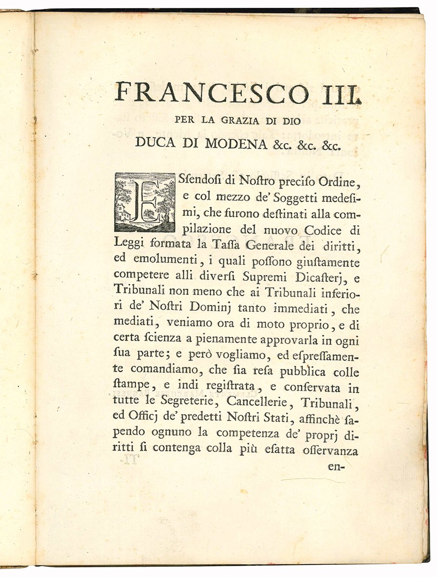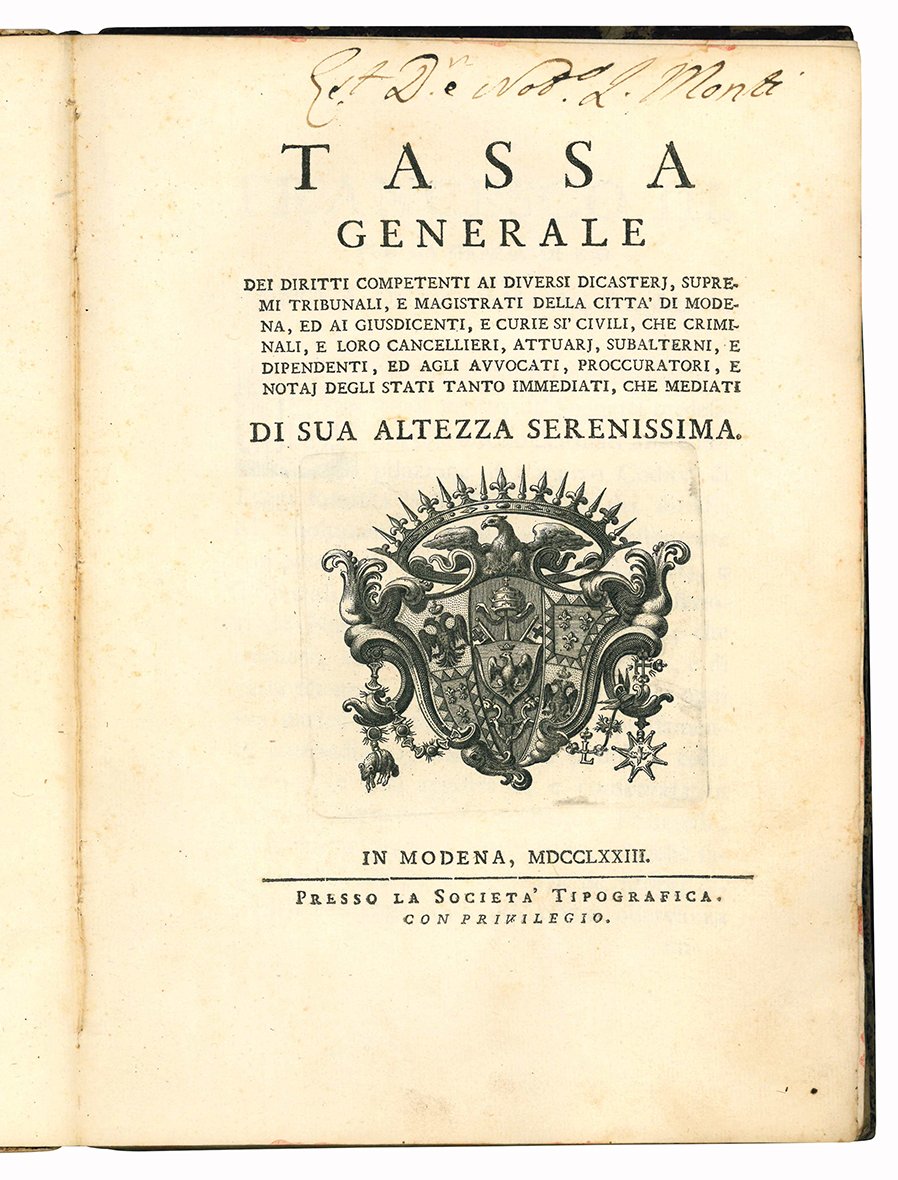 Tassa generale dei diritti competenti ai diversi dicasterj, supremi tribunali, e magistrati della città di Modena