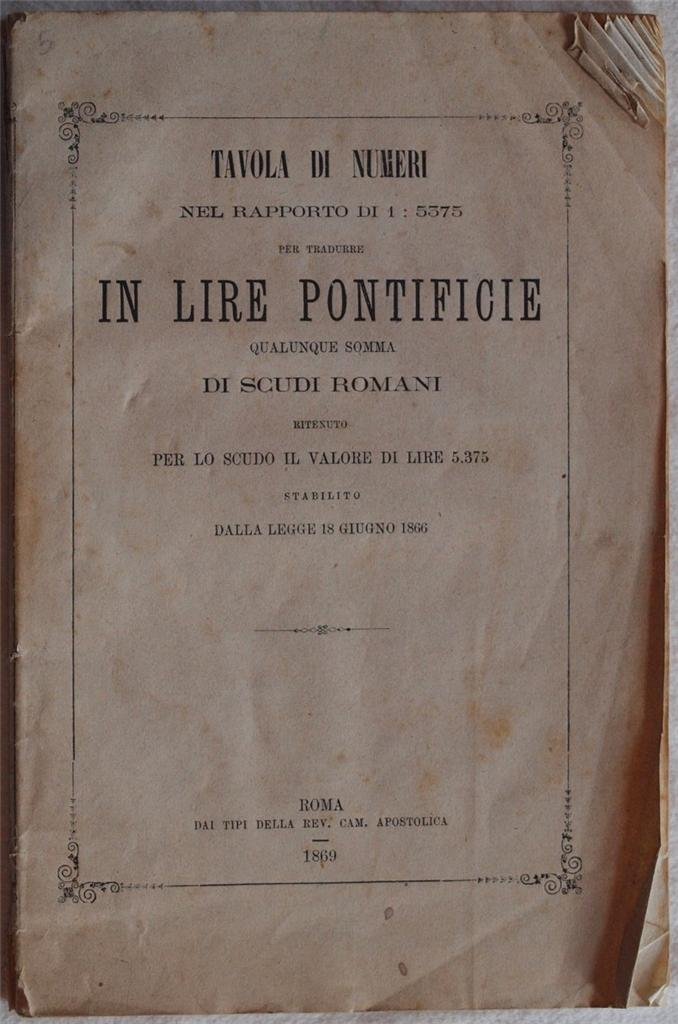 In 8. Dim. 22x14,5 cm. Pp. II+45. Interessante opera del 1869, una tavola di cambio dagli scudi romani alle lire pontificie secondo il valore stabilito dalla legge del 18 Giugno 1866. Insieme al volume un ritaglio di giornale del 14 Agosto 1980 "La letteratura numismatica nei secoli dal XVI al XVIII di Gennaro Angiolino. In buone condizioni. Brossura editoriale decorata. Copertina editoriale in buone condizioni generali con lievi usure ai margini e dorso. Legatura in buone condizioni. All'interno le pagine si presentano in buone condizioni con fioriture. Interesting work of 1869, a change planche from roman scudi to church liras according to the value established by the law of the 18th of June 1866. Together with the volume a cutting of magazine of the 14th of August 1980 "La letteratura numismatica nei secoli dal XVI al XVIII by Gennaro Angiolino In good conditions. Editorial original cover Editorial cover in good general conditions slightly worn in the edges and spine. Binding in good conditions. Inside pages are in good conditions with foxings.