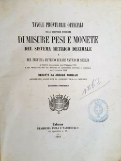 Tavole prontuarie officiali della reciproca riduzione di misure pesi e monete del sistema metrico decimale e del sistema metrico legale antico di Sicilia ai termini della legge del 21 luglio 1861.