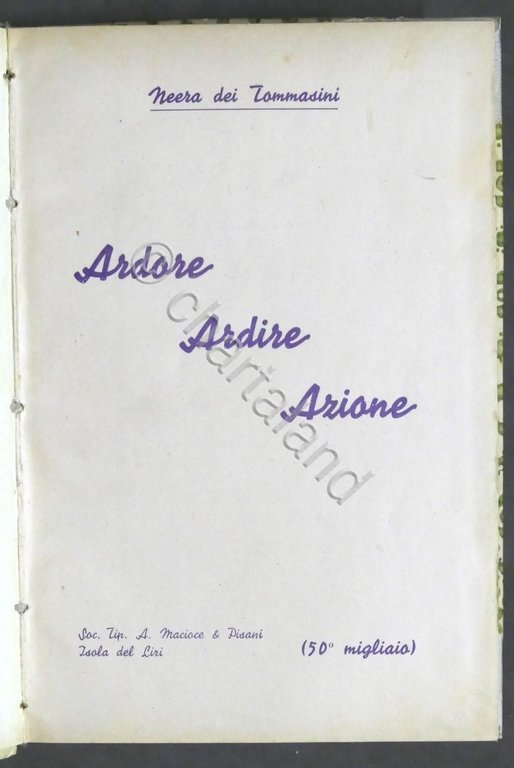 Neera dei Tommasini - Ardore Ardire Azione - Commedia Fascista Sportiva in Tre Atti - 2^ Edizione Italiana Pag. 176 + 72 pagine pubblicitarie Copertina rigida non coeva - Testo in italiano. Condizioni molto buone.