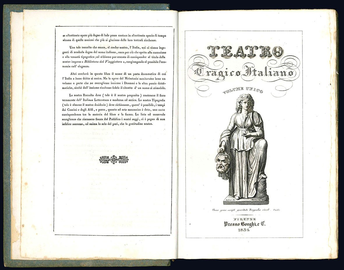 In 8vo (cm. 21,5); bel cartone edit. stamp. color carta da zucchero (un po' inscurito); pp. (12), 853, (3). Con 4 titoli e 4 ritratti inc. Autori: Alfieri, Maffei, Monti, Manzoni, Pindemonte Ipp. e Gio., Varano, Foscolo, Granelli, Bettinelli, Pellico, Benedetti, Della Valle, Conti, Niccolini. Bellissima copia in parte a ff. chiusi. Bella ediz. su carta fine. Vol. II della Bibl. Part. del Viaggiatore.