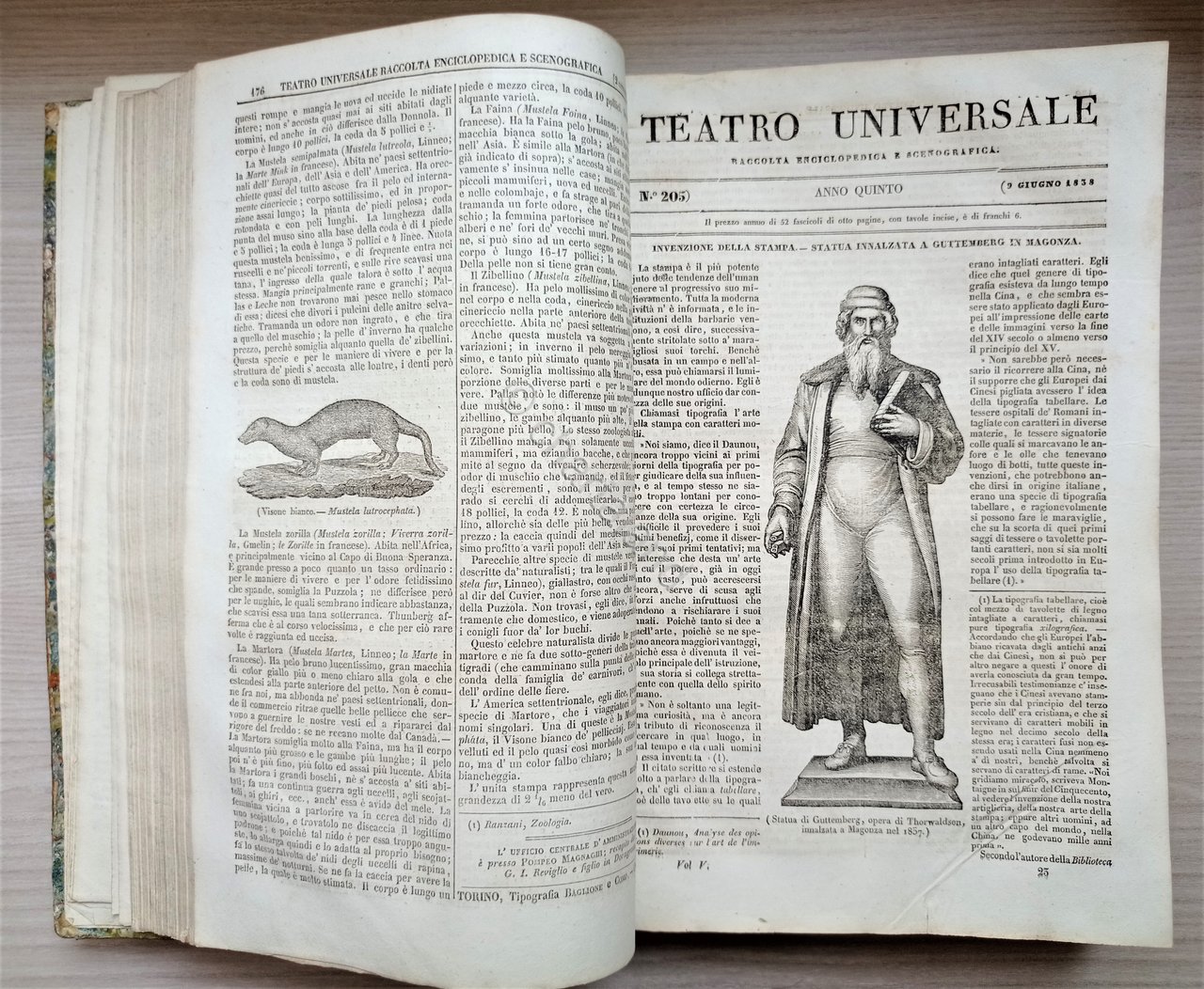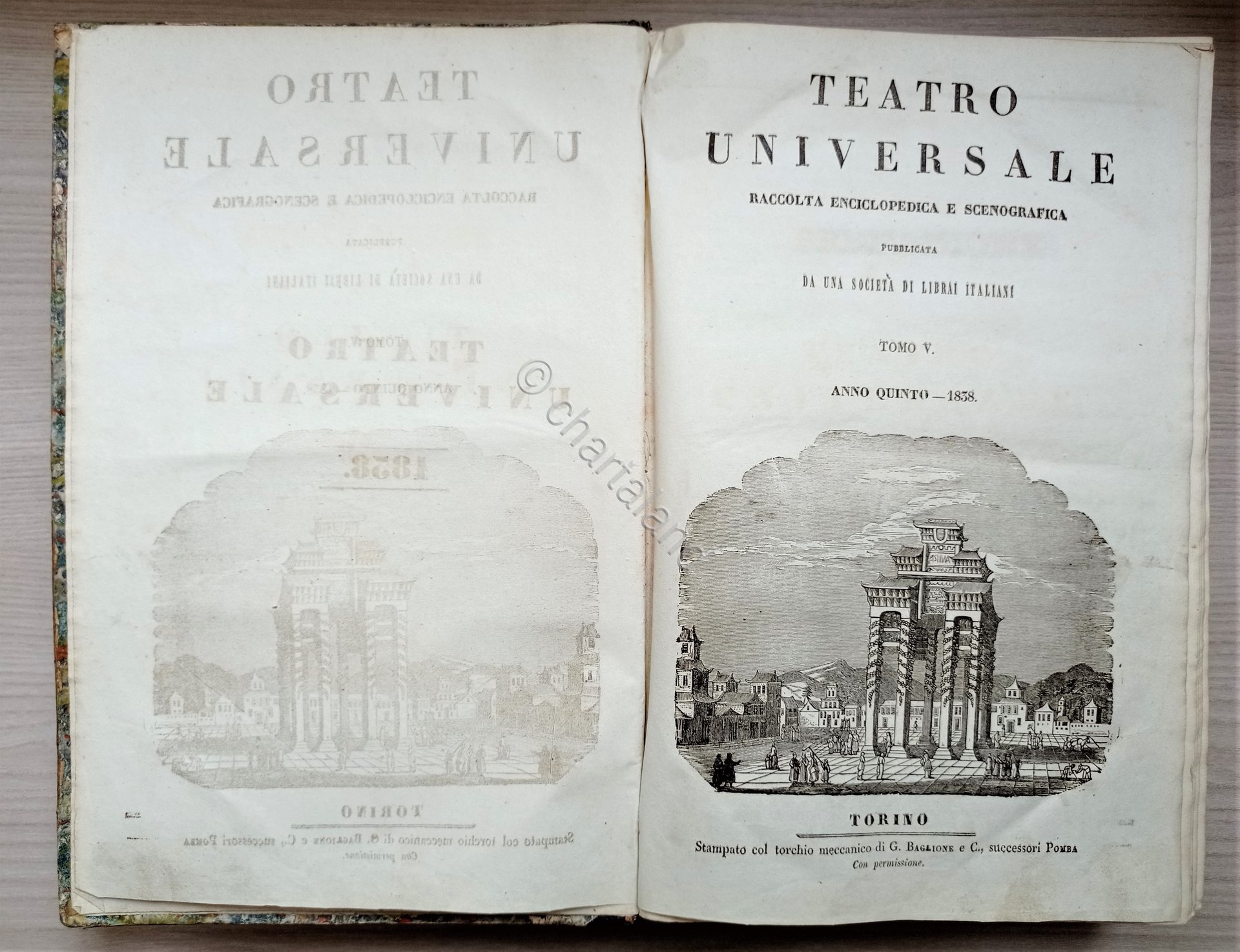 Teatro Universale: Raccolta Enciclopedica e Scenografica - Anno V e VI - ed. 1838 Testo in lingua italiana. Pagine XIII, 416 ( Anno V ) + 416 ( Anno VI ). Copertina rigida. Condizioni generali buone con alcuni segni del tempo come da foto.