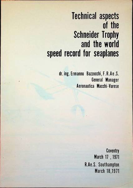 13 p., [67] c. di tav., 31 cm, bross. Condizioni : USATO - Stato : Buono. Altre note : La Coppa Schneider fu una competizione per idrovolanti istituita nel 1911 per incoraggiare il progresso tecnologico, soprattutto in campo motoristico, nell'aviazione civile, ma divenne ben presto una gara di pura velocità su circuito triangolare inizialmente di 280 e poi di 350 km. La prima edizione risale al 1913, ma divenne popolare soprattutto negli anni venti e i primi anni trenta: alcune corse attirarono folle di oltre 200.000 persone. Il fondatore di questa gara fu Jacques Schneider, un finanziere appassionato di aerei e mongolfiere, ed offriva un premio di 1.000 sterline al vincitore. Il nome ufficiale della competizione, in francese, era "Coupe d'Aviation Maritime Jacques Schneider". Ermanno Bazzocchi (Tradate, 27 marzo 1914 " Tradate, 7 luglio 2005) è stato un ingegnere, dirigente d'azienda e politico italiano, che lavorò principalmente presso l'Aeronautica Macchi di Varese dove progettò vari modelli di aerei, come l'MB.308, l'MB-323, l'MB-326 e l'MB-339.