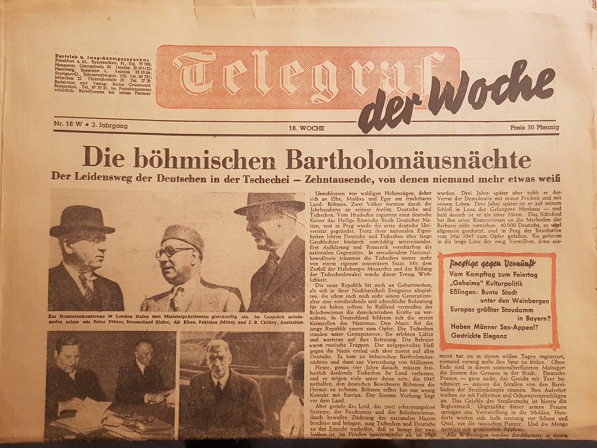 Die Ausgabe aus dem Jahr 1947 beinhaltet mit dem Artikel "Die böhmischen Bartholomäusnächte" allein eineinhalb volle Zeitungsseiten zur Vertreibung der Deutschen aus der Tschechoslowakei. Hier wird detailliert über Folter, Exekutionen und Prager Gefängnisse berichtet. Die Ausgabe umfasst weitere sehr interessante Texte: "Harlankinade" (über den Prozess gegen Veit Harlan), "Bunte Stadt unter Weinbergen" (über das unzerstörte Eßlingen), "Glanz der Zeichnung" (über Josef Hegenbarth) und andere. Seltenes Exemplar aus der Zeit kurz nach 1945! - - - ACHTUNG! Dieses Buch kann wegen seines Gewichts oder seiner Größe nur als PAKET verschickt werden. Innerhalb Deutschlands 5,80 Euro. (Portokosten ins Ausland bitte erfragen.) / ATTENTION! Due to its weight or size this book can only be sent as a PARCEL. Within Germany 5,80 Euro (For shipment abroad please ask.) ################## LIEBE KUNDEN, WIR MACHEN UNSERE JÄHRLICHE FRÜHLINGSAKTION MIT 30% RABATT AUF DEN GESAMTEN BESTAND. DIE ERMÄSSIGUNG GILT AB SOFORT, DER RABATT WIRD NACH IHRER BESTELLUNG VON DEN PREISEN ABGEZOGEN UND SIE ERHALTEN DEN ENDBETRAG VON UNS. ÜBER IHR INTERESSE AN UNSEREN SELTENEN STÜCKEN WÜRDEN WIR UNS WIE JEDES JAHR SEHR FREUEN ###################