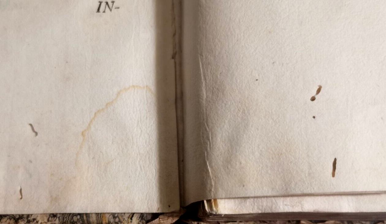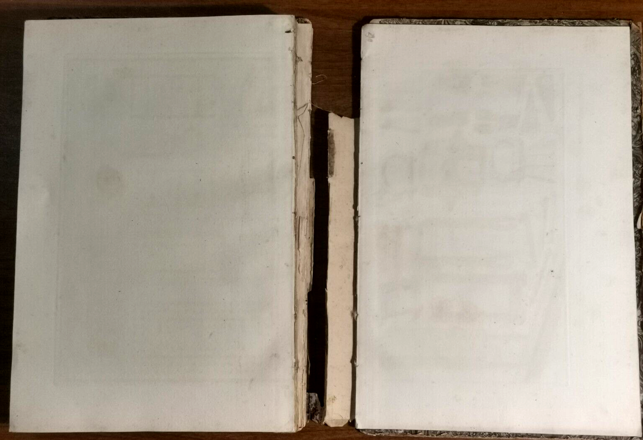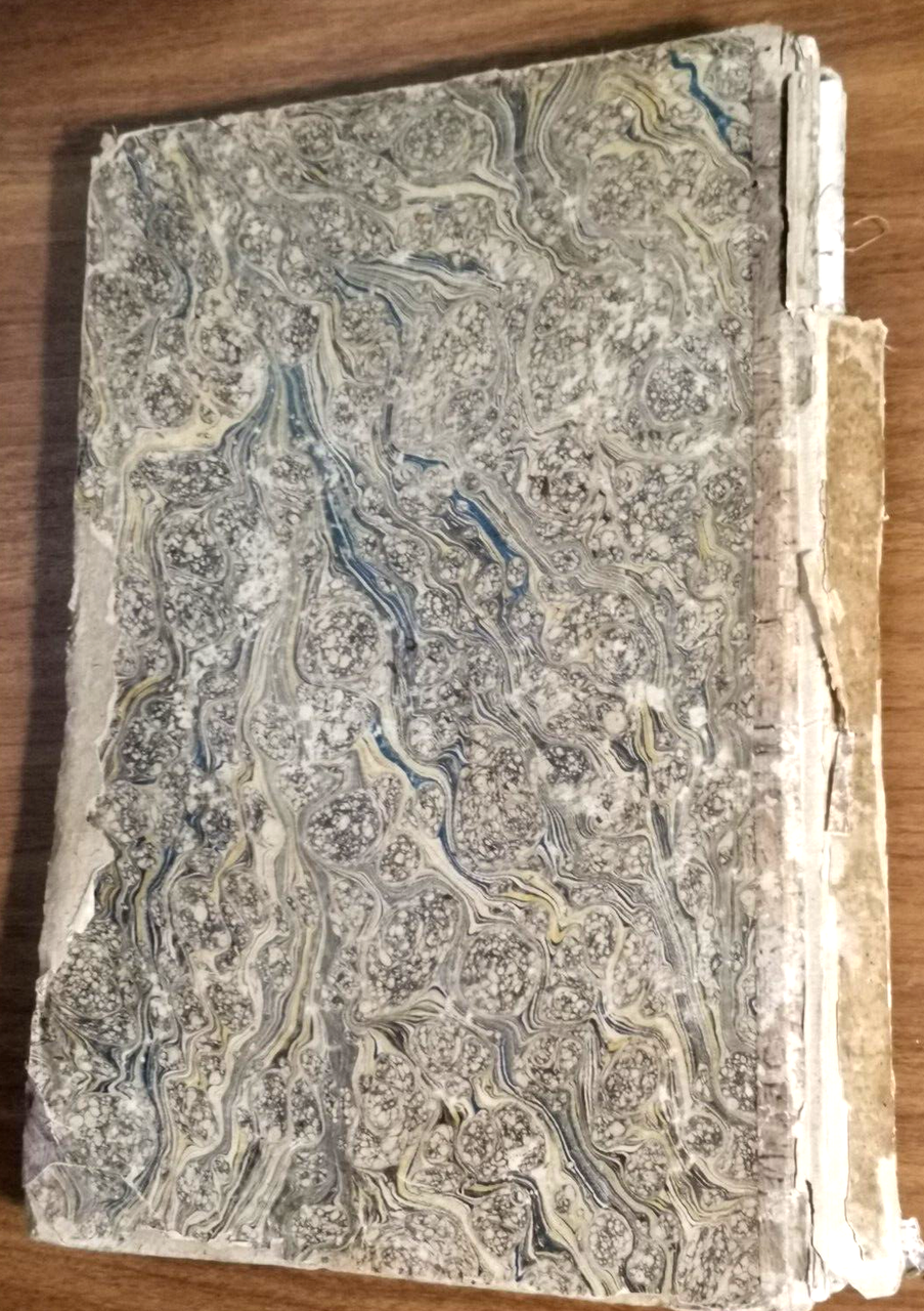 copertina antica in cartone muto con piatti marmorizzati. stato di conservazione: molto buono (primo quinterno e ultime due tavole slegate dal resto del volume e volanti, copertina fortemente malridotta con mancanze al dorso e spellature, forte odore di naftalina, sporadiche fioriture, marginali piccole gallerie di tarlo estinto, piccola scritta a penna coeva, esemplare comunque fresco e marginoso). CONTROLLATO PAGINA PER PAGINA