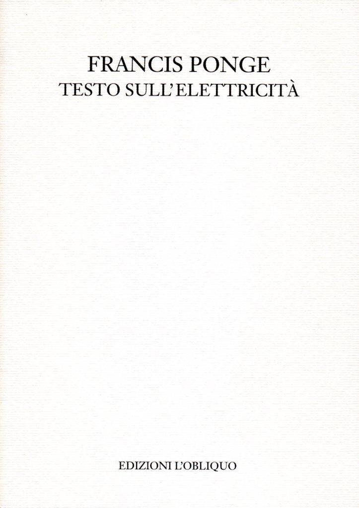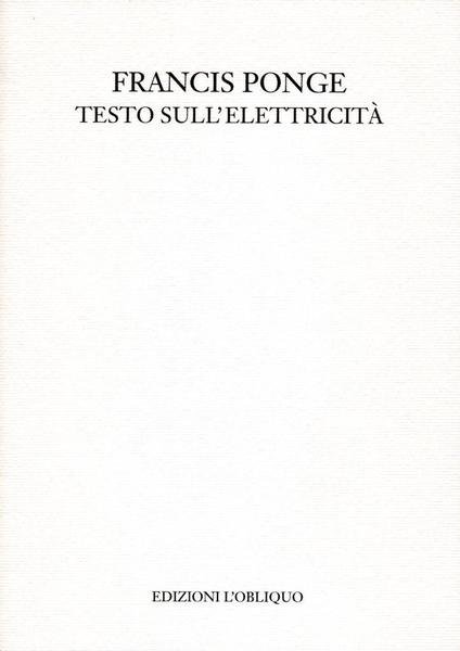 Testo sull'elettricità, prima edizione settembre 1997, pp. 41, formato 12 x 17.<BR>Copertina morbida di colore bianco con titoli in nero al piatto anteriore. Titolo originale dell'opera: Texte sur l'electricitè. Versione dal francese di Daniele Gorret. Edizione stampata in 300 esemplari, 60 dei quali contengono un'acquatinta fuori testo di Sergio Battarola, nostra n. 32.<BR>Ottime condizioni.