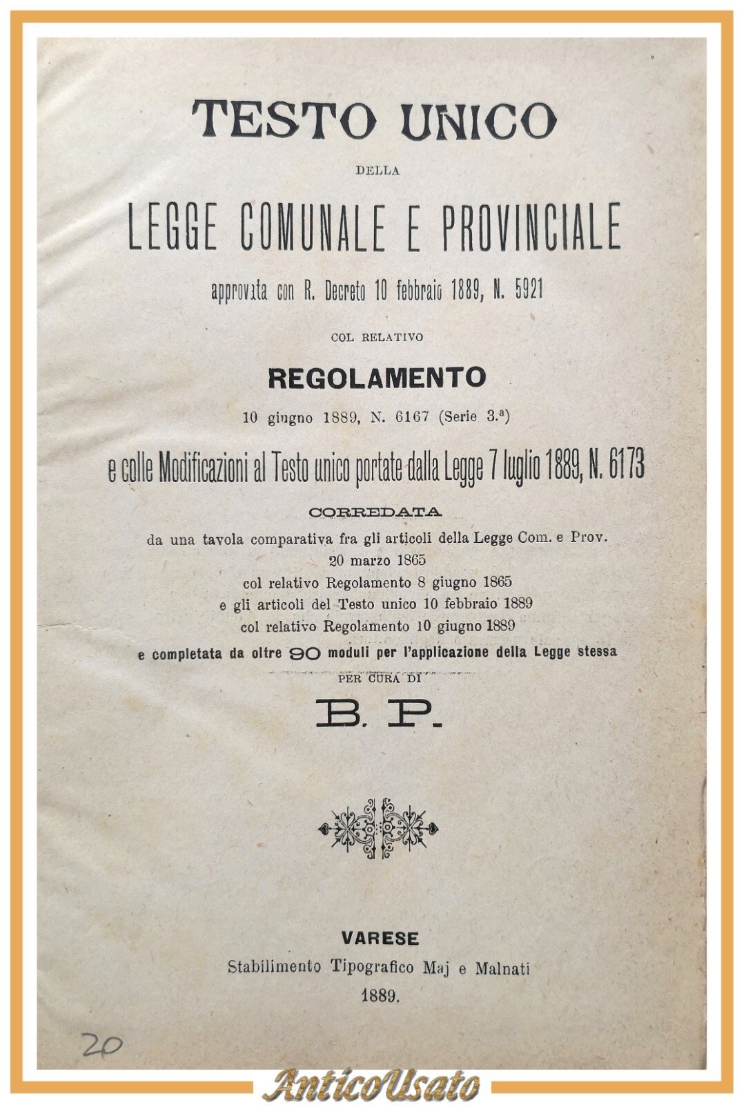 TESTO UNICO DELLA LEGGE COMUNALE E PROVINCIALE 1889 Maj e Malnati Libro antico