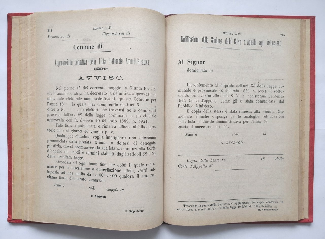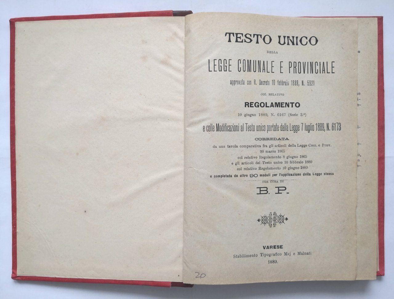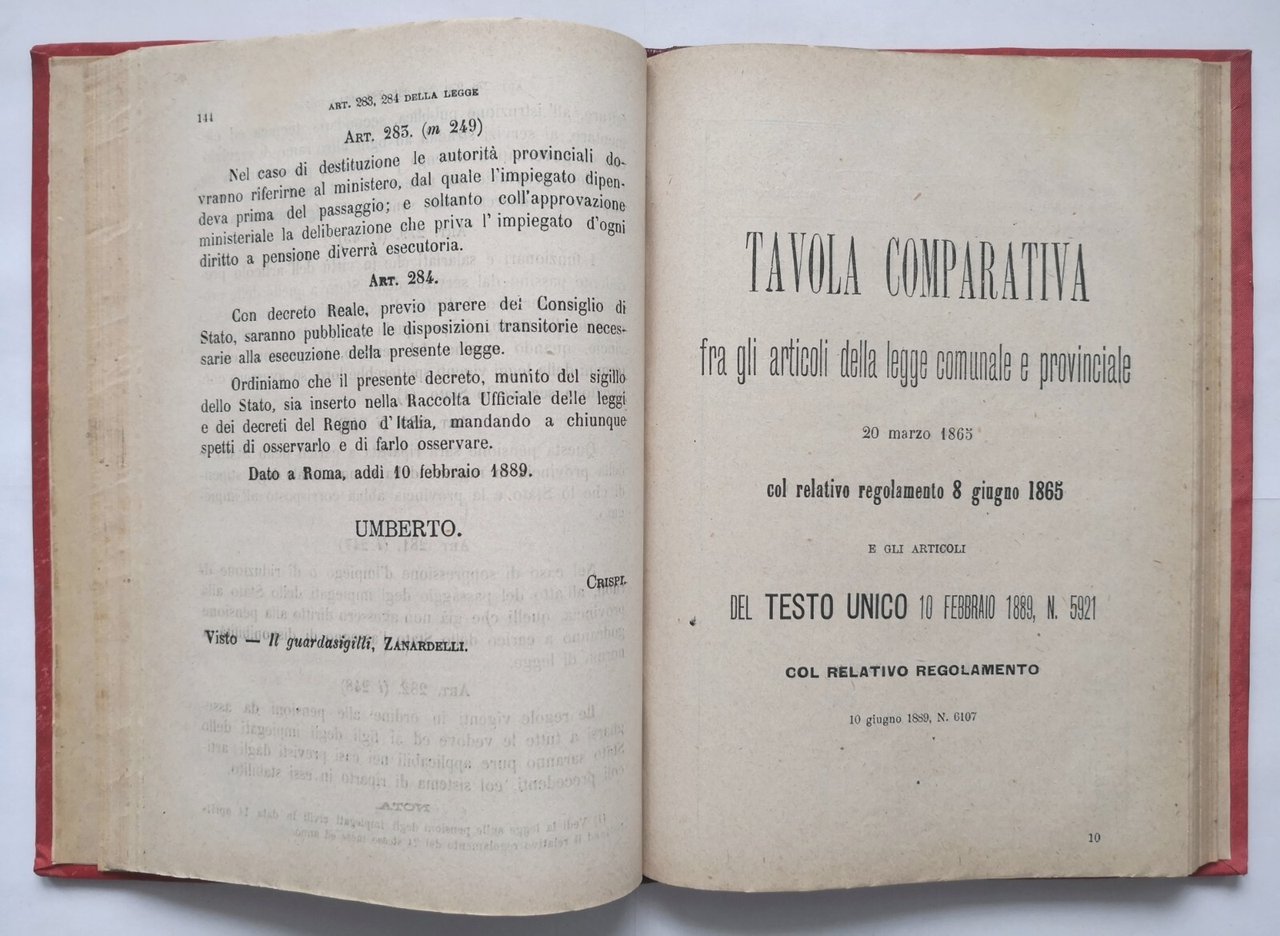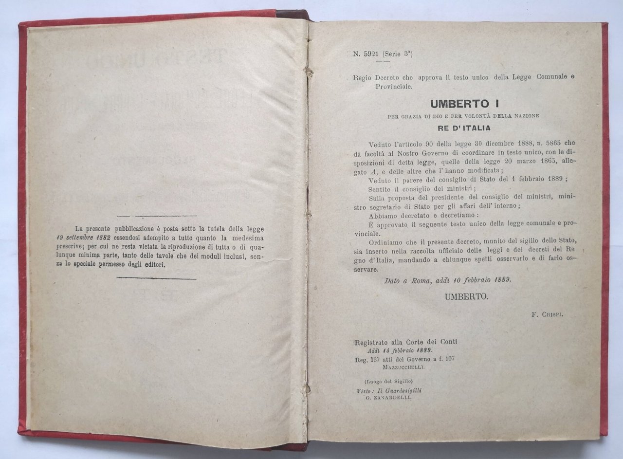 TESTO UNICO DELLA LEGGE COMUNALE E PROVINCIALE approvata con Regio Decreto 10 febbraio 1889, Numero 5921 con relativo Regolamento 10 giugno 1889, Numero 6167.