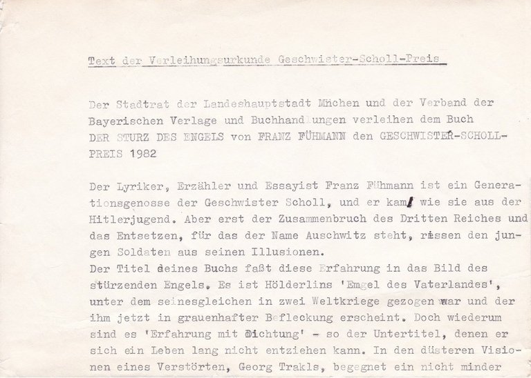 Im Jahr 1982 erhielt Franz Fühmann in der damaligen BRD den Geschwister-Scholl-Preis für sein Buch "Der Sturz des Engels". Fühmann setzte sich in diesem Buch mit dem österreichischen Lyriker Georg Trakl wie auch mit sich selbst auseinander. Hier handelt es sich um den Text der Verleihungsurkunde. Das Manuskript liegt im Original vor: Schreibmaschine mit wenigen handschriftlichen Korrekturen. Das Redemanuskript wurde damals an die für Fühmann sehr wichtige Autorenbuchhandlung in Westberlin (Carmerstraße, Berlin-Charlottenburg) übergeben. In dem überaus interessanten Text heißt es unter anderem: "In den düsteren Visionen eines Verstörten, Georg Trakls, begegnet ein nicht minder Verstörter Bildern der Heillosigkeit, deren Wahrheit ihn nicht nur im Augenblick tiefster Verzweiflung überwältigt; immer wieder kollidierte sie auch mit der anderen Vision, an der der Bürger der DDR allen Erfahrungen mit Brüchen und Grenzüberschreitungen der neuen Heilslehre zum Trotz unverbrüchlich festhält: Es ist die Vision des Sozialismus, der die Verwandlung kranker und barbarischer in heile und humane Gesellschaften auf seine Fahne geschrieben hat. Der Konflikt, dem der Sozialist und der Dichter Fühmann sich stellen, ist der uralte Konflikt zwischen einer Doktrin, die sich absolut setzt, und einer Dichtung, die auszusagen hat, was Menschen leiden, gerade auch, wenn es die Leiden an einer Lehre sind, deren ursprünglicher Heilscharakter nicht von ihnen bestritten wird. Es macht die Würde und die Faszination der in Fühmanns Bekenntnisbuch beschriebenen Existenz aus, daß sie diesen Konflikt durchhält." Diese Original-Manuskriptfassung mit einigen Korrekturen, aus dem Nachlaß der Lieblingsbuchhändlerin Fühmanns in Westberlin, liegt nach aktuellem Stand selbst im Archiv nur in Kopie vor. ######################## LIEBE KUNDEN, WIR MACHEN UNSERE JÄHRLICHE WEIHNACHTSAKTION MIT VOLLEN 30% RABATT AUF DEN GESAMTEN BESTAND UND FREUEN UNS AUF IHR INTERESSE. (Die Ermäßigung ist nun bereits im angezeigten Preis enthalten) #########################