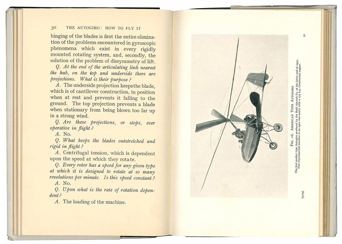 In 8vo (mm 183x118); pp. XIII, [1], 82, 24, [20] c. di tav. fuori testo, di cui 2 ripiegate. Numerose illustrazioni, sia fotografiche che al tratto. Prefazione di Juan de la Cierva, l'ingegnere spagnolo che costruì autogiri nel Regno Unito in collaborazione con Avro. Tela editoriale blu con titolo in oro al dorso e al piatto anteriore. Sovraccoperta illustrata in bianco e nero. Piccole mancanze alla sovraccoperta. Prima edizione.