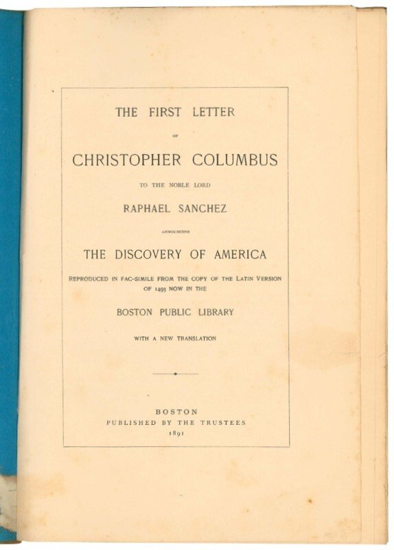 Mm. 269x180. Pp. [2], 17, [3, 6], [10], [2 bianche]. Reproduced in fac-simile from the copy of the Latin version of 1493 now in the Boston Public Library. With a new translation. Con 2 ex-libris 'Marini' del XX secolo al contropiatto anteriore. C. lievemente ed uniformemente brunita, fioriture occasionali. Rilegato in mezza pergamena. Piatti un po' usurati. Prima edizione.