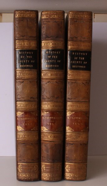 3 vols., folio, with 46 engraved plates (3 FINELY COLOURED BY HAND), 8 engraved maps and plans (one double-page) and numerous pedigrees in the text, some light and negligible marginal foxing, county map offset lightly offset as often; strongly bound in contemporary half calf, marbled boards, the first volume very neatly rebacked to style, old backstrip well laid down, backs gilt extra with four raised bands, these tooled in gilt to a stylised floral design suspended within a double gilt frieze, the whole contained by double gilt fillets, compartments tooled in blind with a floral frame, head and tail of backs tooled in gilt to a floral design repeated in inversion, lowest panel tooled in gilt with a reflected floral motif, double gilt morocco labels in black and red, the second of these in each case tooled in gilt at corners with a stylised floral flourish, marbled endpapers, sprinkled edges, covers a trifle age-marked, four joints a little rubbed else a very good, clean, sound copy. THE CHRISTOPHER T PEROWNE COPY WITH HIS ARMORIAL BOOKPLATE. This copy has pp.471-2 in vol. I which according to Upcott (p.623*) were cancelled; page 36 of the appendix to this volume is misprinted 32 as called for. Britton's scarce 'Cashiobury Park' leaf, rarely found, is not present with this copy which is complete without it. The plates, maps and plans have been bound together at the end of each volume with the exception of the plate 'High Altar Screen, St. Alban's Abbey Church', which is present as frontispiece to the first volume, and the county map which is similarly placed in the third volume.