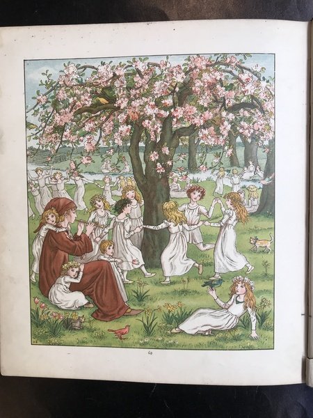 In-8°, pp. (4), 5 -64, numerose illustrazioni in xilografia a colori disegnate da Kate Greenaway e stampate da Edmund Evans, legatura editoriale figurata a colori. Carte di sguardia grigio blu. Prima edizione inglese. Kate Greenaway (London, 1846- Hampstead, 1901). Figlia d’arte (suo padre era il noto incisore J. Greenaway), cresciuta in un ambiente sereno ha precocemente fatto notare il suo talento e già all’età di 17 anni riceve i primi riconoscimenti. Frequenta la Heatherley’s School of Art e la Slade School of Fine Art. A partire dal 1877 fino al 1895 realizza una serie di illustrazioni a colori incise da Evans per le edizioni Routledge. I suoi disegni sono intensi sempre ricchi di fantasia e dolcezza, i suoi bambini dai tratti e dai colori sempre delicati accompagnano semplici storie di ordinaria quotidianità ma molto piacevoli, sempre contrassegnate da quella serenità che Lei stessa aveva vissuto nella sua infanzia. K. G. riesce nei suoi disegni a rievocare uno stile di vita idilliaco ma nello stesso tempo ci ha fornito interessanti dati su come vivevano i bambini nell’epoca vittoriana. La sua arte raffinata, qualificabile come proto - Art Nouveau, ha influenzato molti illustratori, da Beardsley a Boutet de Monvel, a Willebeek le Mair. Il suo famoso Under the Window fu pubblicato molte volte da editori diversi, non solo in Gran Bretagna ma anche in Francia e Germania superando i centomila esemplari di tiratura. Appassionata anche di moda per bambini ha creato una linea di vestiti in stile vittoriano. In Gran Bretagna ogni anno a partire dal 1955 una medaglia che porta il suo nome viene assegnata al miglior lavoro di illustrazione per bambini, e a conferma della severità dei requisiti per ottenere il premio alcuni anni sono privi di vincitori in quanto nessun libro ha soddifatto le esigenze del concorso. Diz. degli Illustratori simbolisti e Art Nouveau; Thomson p.28, 17a.