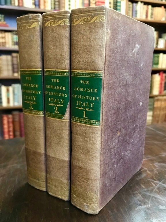 3 volumi in-16° (cm. 15,6), legature coeve in tutta percallina con titolo in oro su tassello ai dorsi, alcune decorazioni in oro ai dorsi, tagli spruzzati; pp. VIII 348, [4] 388, [4] 334 [2] in buono stato, alcuni aloni alle sole prime carte. Interessante interpretazione storica d'Italia. Buon esemplare. (NF7)