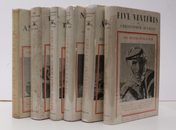 6 vols., 8vo., First Edition, with very numerous plates and maps in the text, three volumes with endpaper maps, one volume with signature on front free endpaper; red cloth, gilt backs, a very good, bright, clean set in unclipped dustwrapper. The set comprises: Ian Hay: Arms and the Men (1950); Eric Linklater: The Campaign in Italy (1951); Christopher Buckley: Norway. The Commandos. Dieppe. (1951); Christopher Buckley: Greece and Crete 1941 (1952); John North: North-West Europe 1944-45. The Achievement of 21st Army Group (1953); Christopher Buckley: Five Ventures. Iraq. Syria. Persia. Madagascar. Dodecanese (1954). The 'Short Official History' was promulgated by H.M. Government to furnish the general reader with a short military history of the Second World War pending the publication of the numerous Official Histories then commissioning or in progress. The authors were selected by reputation and for their previous association with official sources (most notably in the well-known HMSO wartime pamphlets) and were granted unusual access to official documents and sources of information. As a result, and despite their 'temporary' status, the volumes are not only vividly written but remarkably detailed and well-illustrated. . The series was originally intended to comprise eight volumes but two of those projected, 'The Campaigns in Africa' and 'The Far East 1941-1945' were never published, possibly because by then the first cluster of Official Histories was nearing publication stage. ALL VOLUMES ARE ELUSIVE IN THIS CONDITION; COMPLETE SETS (ESPECIALLY IN DUSTWRAPPERS) ARE SELDOM OFFERED FOR SALE. Enser pp.202, 228, 298, 191, 76 and 273 respectively.