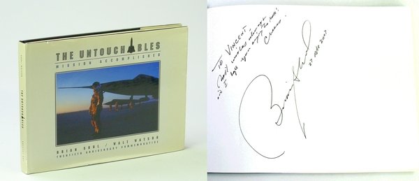 Signed and inscribed by Brian Shul upon front free endpaper. Oblong 14" x 10.75". 184 pages. Glossary. Profusely illustrated with stunning colour photos. This commemorative edition contains new and revised text and photographic material in addition to material previously published in The Untouchables in 1993. "Shul and Watson take you with them on their hottest SR-71 missions during the Libyan Crisis in 1896. Flying in support of the F-111 bombing raid on Libyan terrorist camps, they were the only SR-71 crew ever to fly three missions in three days. Roaring across the African desert faster than a Magnum .357 bullet, the crew reveals in riveting detail what it was like to outrun enemy missiles and complete the most exhausting missions of their Blackbird career. Masterfully intertwines cockpit action with the fascinating revelations of that unique cadre of civilians who helped design, build and maintain the most remarkable aircraft of the 20th Century. Lavishly illustrated with rare [color] photographs, [this book] is a riveting complementary volume to Sled Driver, taking you straight into the thick of combat through the firsthand perspectives of both Pilot and RSO. Transports you directly into the cockpit as the mission clock ticks down, revealing through the poignant words of those who were there why the people and the plane were truly untouchable." - dust jacket. "The closest you will come to flying a real combat sortie in the SR-71. Fascinating revelations." - Major General Walker Abrahms, USAF. Publisher's black cloth adorned with bright gilt lettering and illustration. Unmarked. Contents clean and bright. Binding intact with minor lean. Boards mildly undulating. Somewhat above-average wear to dust jacket now preserved in glossy new archival-grade Brodart. A worthy signed copy of this epic SR-71 memento. Book