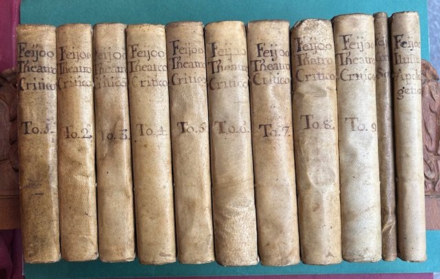 11 volumi in-8°, pp. 3956, prefazioni ed indici n.n., affascinanti legature coeve in pergamena floscia con chiusuara a doppio fermaglio con piccolo bottone. L'insieme è formato da volumi di diverse edizioni, dalla seconda alla quinta. L'ultimo volume, il de Justa ha una lacuna al margine esterno della pergamena del piatto superiore. Nell'insieme opera in perfette condizioni in affascinante e curiosa legatura strettamente coeva. Opera curiosa che quando uscì ebbe un grandissimo successo. Sottomise a esame critico ogni aspetto dell'attività umana: letteratura, filosofia, storia, scienze mediche e naturali, politica, credenze e superstizioni formando l'oggetto dei 118 discorsi adunati nel Teatro crítico universal e delle 163 dissertazioni raccolte nelle Cartas eruditas y curiosas. Questa somma di conoscenze diverse, che non si lasciano disciplinare entro uno schema preciso, converge verso una chiara e trasparente razionalità che dissolve le nebbie di un pensiero stagnante. I principî del metodo scientifico sono applicati anche ai miracoli e alle più diffuse credenze (Duendes y espíritus familiares, Purgatorio de San Patricio, La campana de Velilla, ecc.) per depurare la bellezza della religione dai vani delirî della plebe incolta (Carta sobre la multitud de milagros). Autodidatta, conoscendo la cultura straniera, il F. ebbe piena coscienza della miseria intellettuale della sua nazione: se oppugna l'esagerata autocritica che nega ogni attività, combatte la passione nazionale quando si rinserri in un'auto-esaltazione (Amor de la Patria y pasión nacional), e pur riconoscendo i valori nazionali (Glonas de España), accetta quelli che vengono dal di fuori (Antipatía de franceses y españoles). Perciò combatte arditamente il marasma scientifico e filosofico del tempo suo (De lo que conviene quitar en las Sumulas; De lo que conviene quitar y poner en la Lógica y Metafísica; De lo que sobra y falta en la Física, ecc.). Nel disdegno di ogni regola e nella sistematica rivendicazione della libertà nella scienza e nell'arte, ci sono accenti di novità che avranno eco più tardi: così in estetica è l'affermazione che c'è un'indefinibile individuale (el no sé que) che sfugge a ogni categoria. L'eloquenza è per lui naturalezza e non arte (Cartas, II, 6); la lingua non sta nel vocabolario ma nel pensiero che essa traduce, e quindi nella libera scelta delle parole in armonia con l'ispirazione (Introducción de voces nuevas). Abbattendo molti idoli e rovinando molte fame usurpate, il F. ebbe numerosissimi oppositori e difensori, che ne diffusero il nome anche fuori di Spagna e ne resero più efficace l'opera in favore del rinnovamento della cultura.