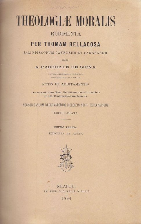 THEOLOGIAE MORALIS RUDIMENTA di Thomam Bellacosa 1894 Napoli d’Auria Libro antic