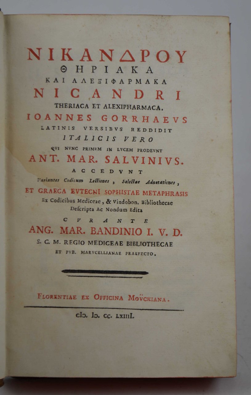 Theriaca et Alexipharmaca. Ioannes Gorrhaeus latinis versibus reddidit italicis vero qui nunc primum in lucem prodeunt Ant. Mar. Salvinius. Accedunt variantes codicum lectiones, selectae adnotationes, et graeca EutecnI Sophistae metaphrasis ex codicibus Mediceae, & Vindobon. Bibliothecae descripta ac nondum edita curante Ang. Mar. Bandinio I.V.D. S.C.M. Regio Mediceae Bibliothecae et pub. Marucellianae praefecto.