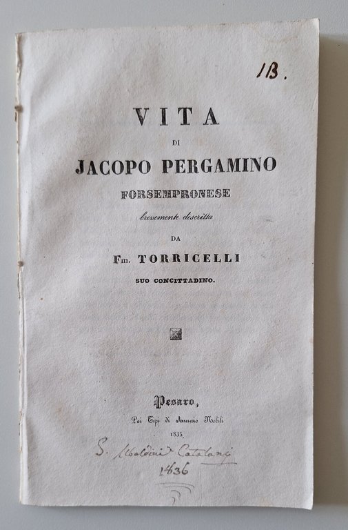 TORRICELLI VITA DI JACOPO PERGAMINO FORSEMPRONESE PESARO A. MOBILI 1835
