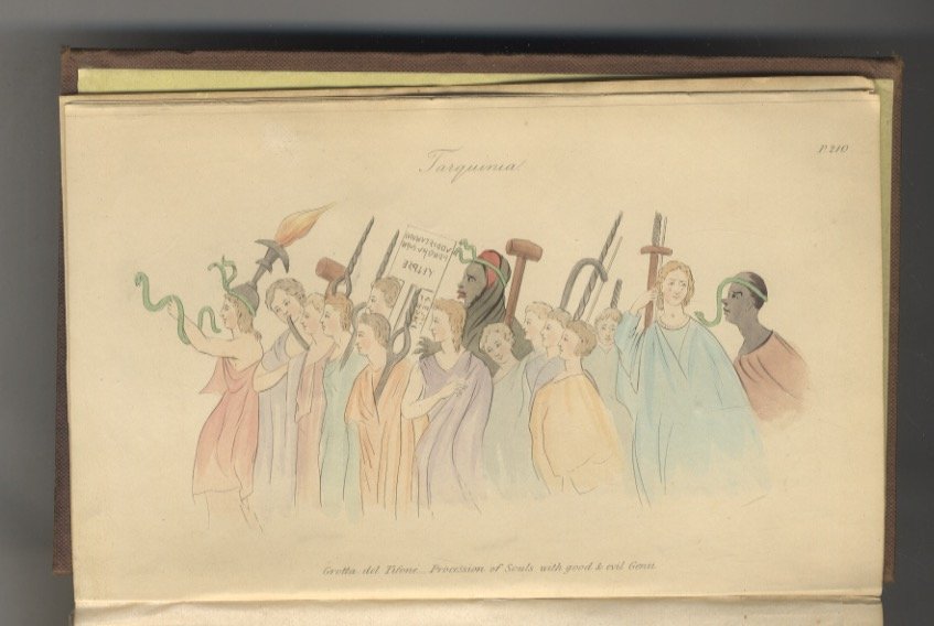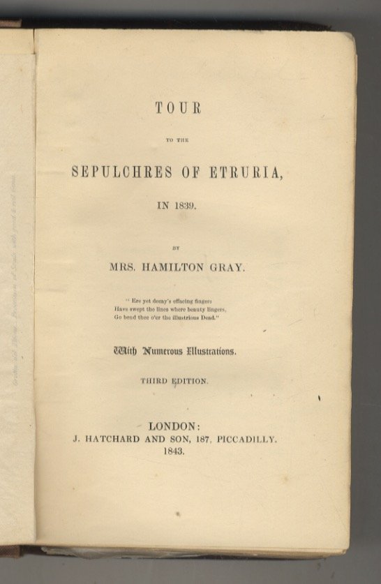 London, J. Hatchard & Son, 1843, in-8, legatura editoriale in piena tela con una coppa etrusca impressa in oro al centro del piatto anteriore, titolo entro cornice architettonica dorata al dorso, pp. XI, [1], 541, [3]. Con 29 tavole incise f.t. protette da veline (una in più di quelle richiamate nell'indice delle tavole), 3 delle quali colorate a mano, 3 più volte ripiegate. Elizabeth Gray si interessò alla storia degli Etruschi dopo aver visitato una mostra dei loro manufatti a Londra organizzata da Domenico Campanari nel 1837. Un segnalibro lasciato nel libro ha causato una delimitata brunitura su due pagine, per il resto bell'esemplare.