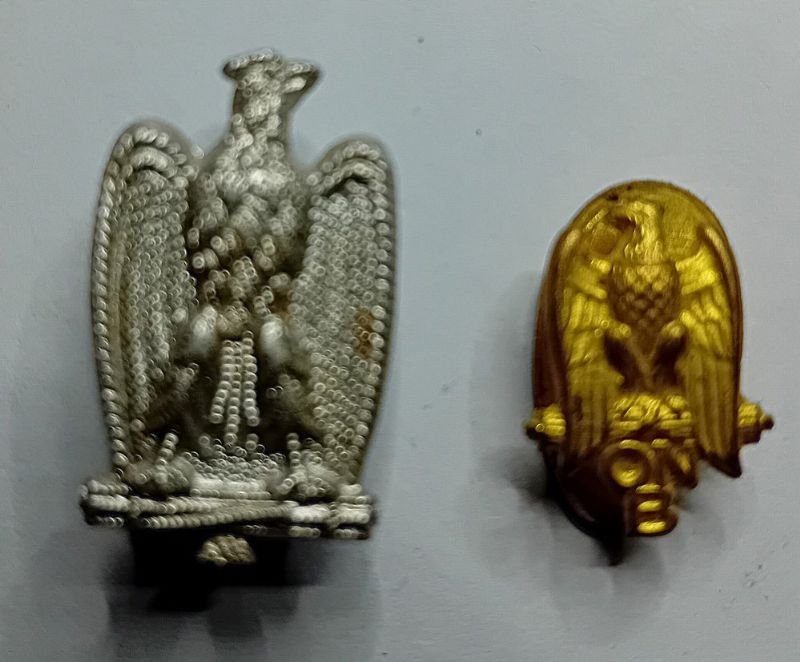 Tra gli artigli il fascio littorio. La dorata, più piccola, cm. 2x1. Applicazione con piastrina per asola.