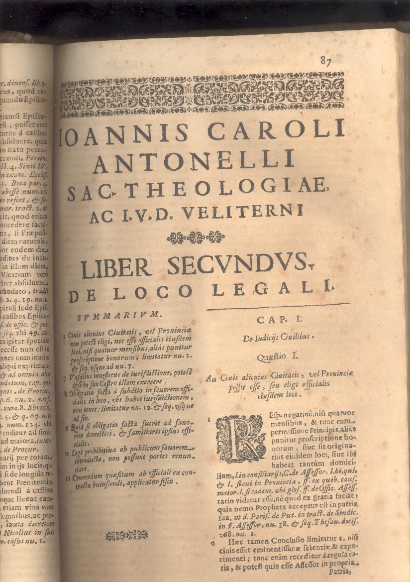 IN 4°, LIBRO I.c.8 CON L'OCCHIETTO.,pp.403, INDEX RERUM ( c.28 ).1. SEGUE IL PROLOGOMENON CON XI TITOLI( pp.55 ). A SEGUIRE CAPUT. III DE ACTIONIBUS ( da pg.56 a pg.74 ) IL II e III CAPITOLO pp. INCORNICIATE, CAPILETTERA e FINALINI INCISI. L'ULTIMA c. CONTIENE L'IMPRIMATUR. LEGATURA IN PIENA PERGAMENA CON TITOLO AL DORSO E 9 NERVI. FRONTESPIZIO FIGURATO CON GRANDE STEMMA DI PAPA CLEMENTE X ( AL SECOLO EMILIO BONAVENTURA ALTIERI ). PICCOLA MACCHIA AL FRONTESPIZIO NELLA PARTE BIANCA INTERNA. A pg.5 DELL'INDEX PICCOLA MANCANZA AL PIEDE NELL'ANGOLO ESTERNO.SEMPRE DELL'INDEX DA pg.29 a 32 NEL PARTE DI TESTA MANCANZA DI PICCOLA PORZIONE DI CARTA CON PERDITA DI ALCUNE PAROLE.BRUNITURE DOVUTE AL TIPO DI CARTA. TESTO SU DUE COLONNE. NELL'INSIEME OTTIMA CONSERVAZIONE DI QUESTO RARO TRATTATO.ID,7110